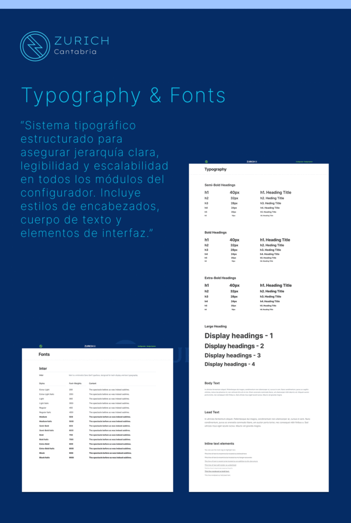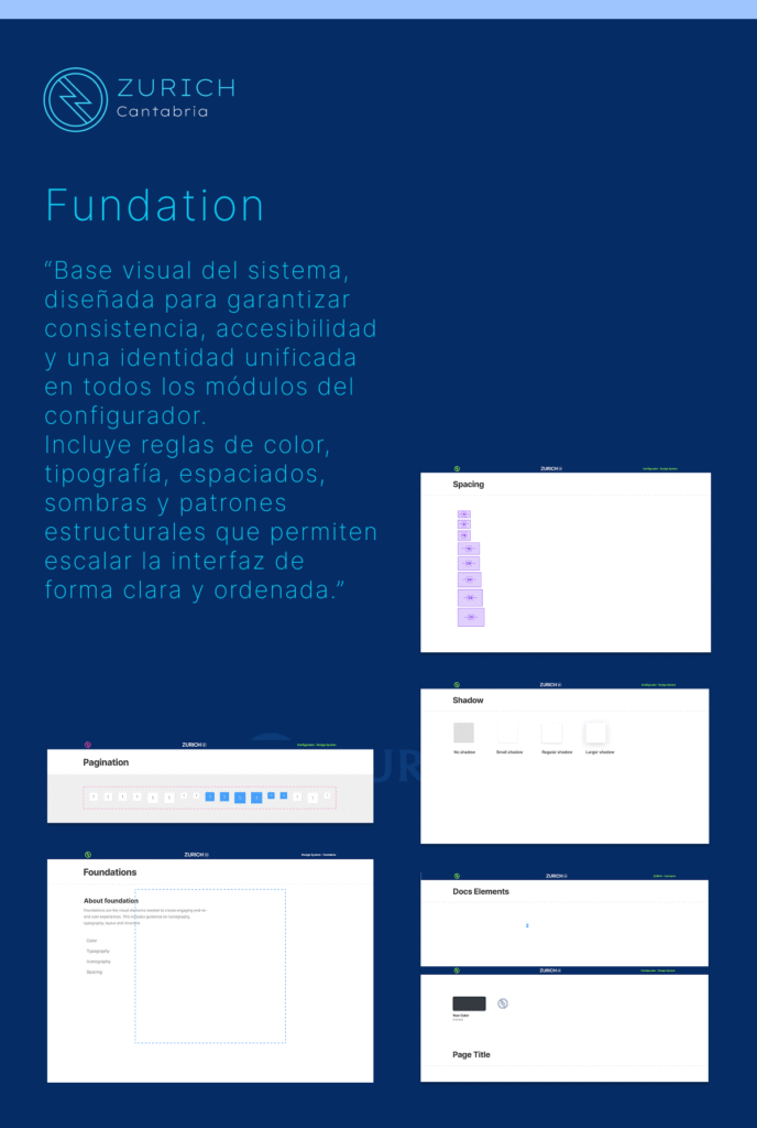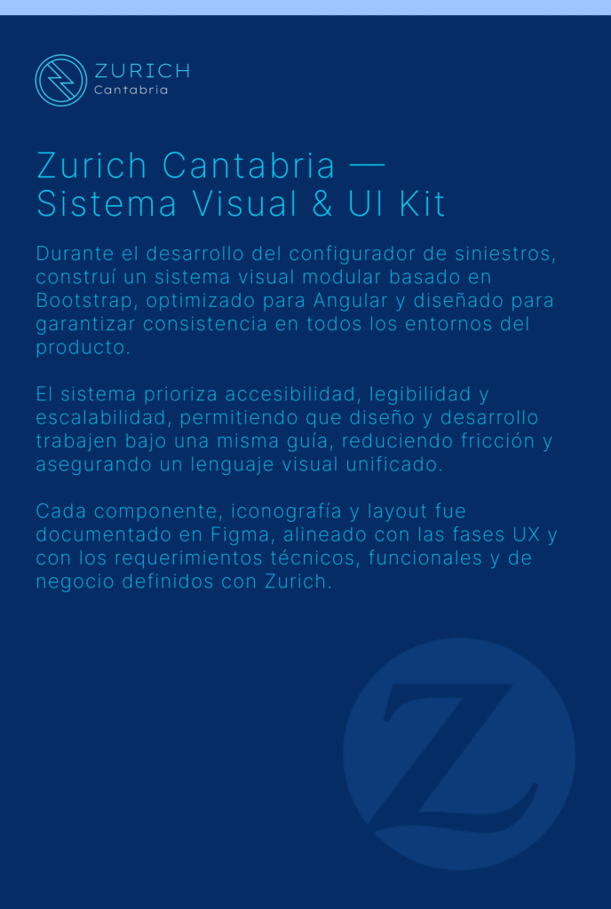 Diseño de un sistema visual escalable compatible con Angular, asegurando alineación con la identidad Zurich y la adaptabilidad a distintos niveles de usuario.